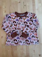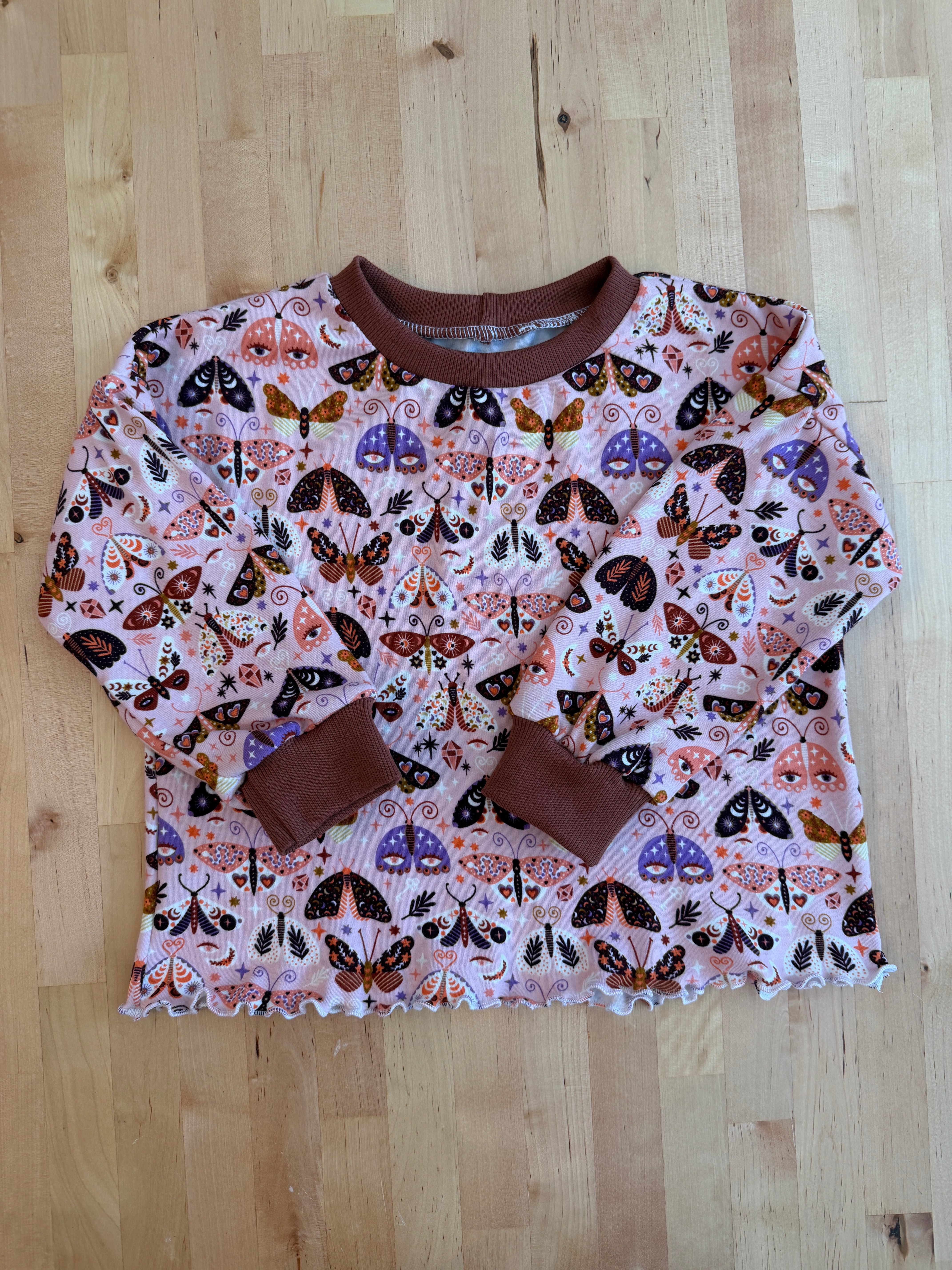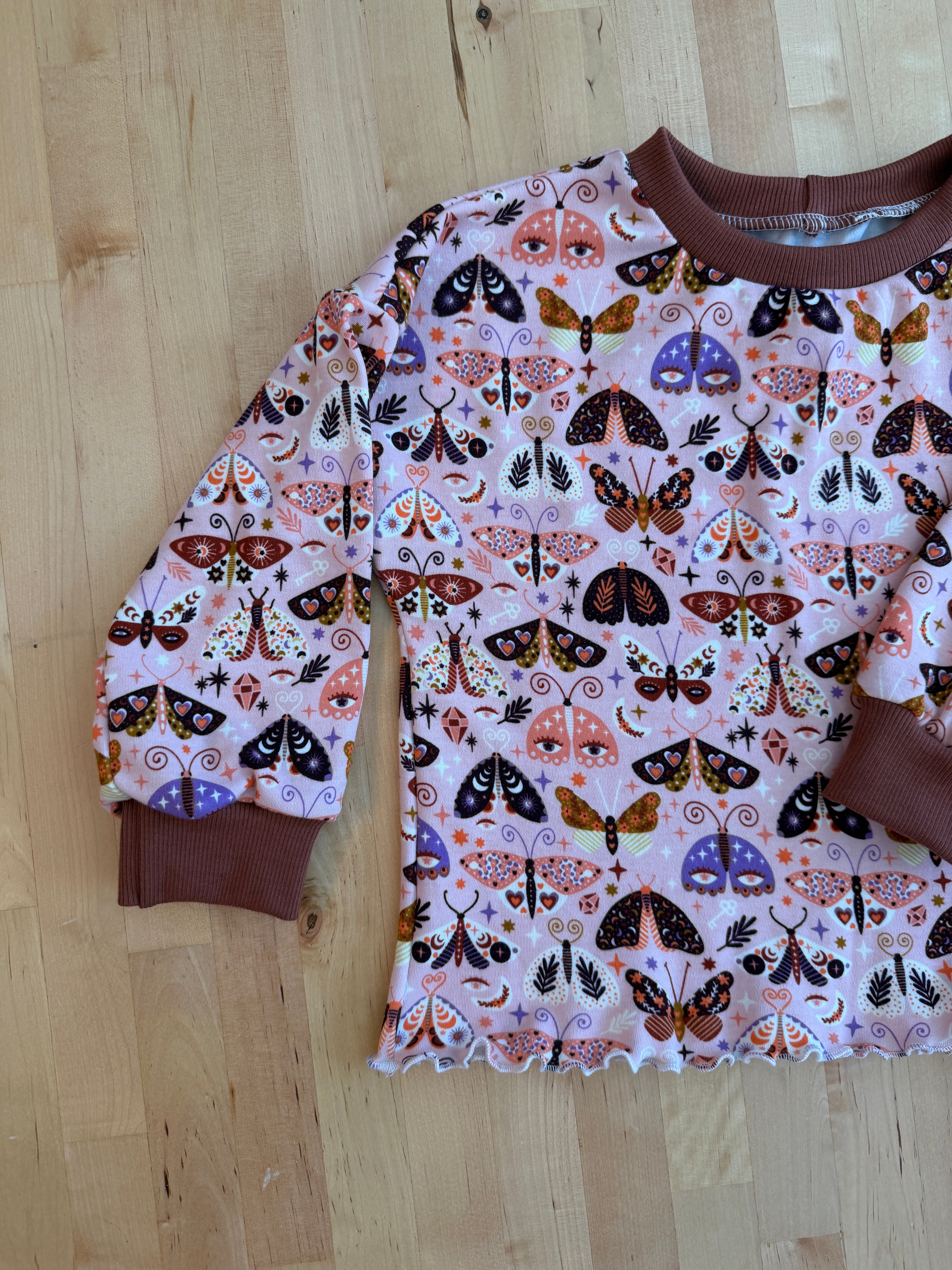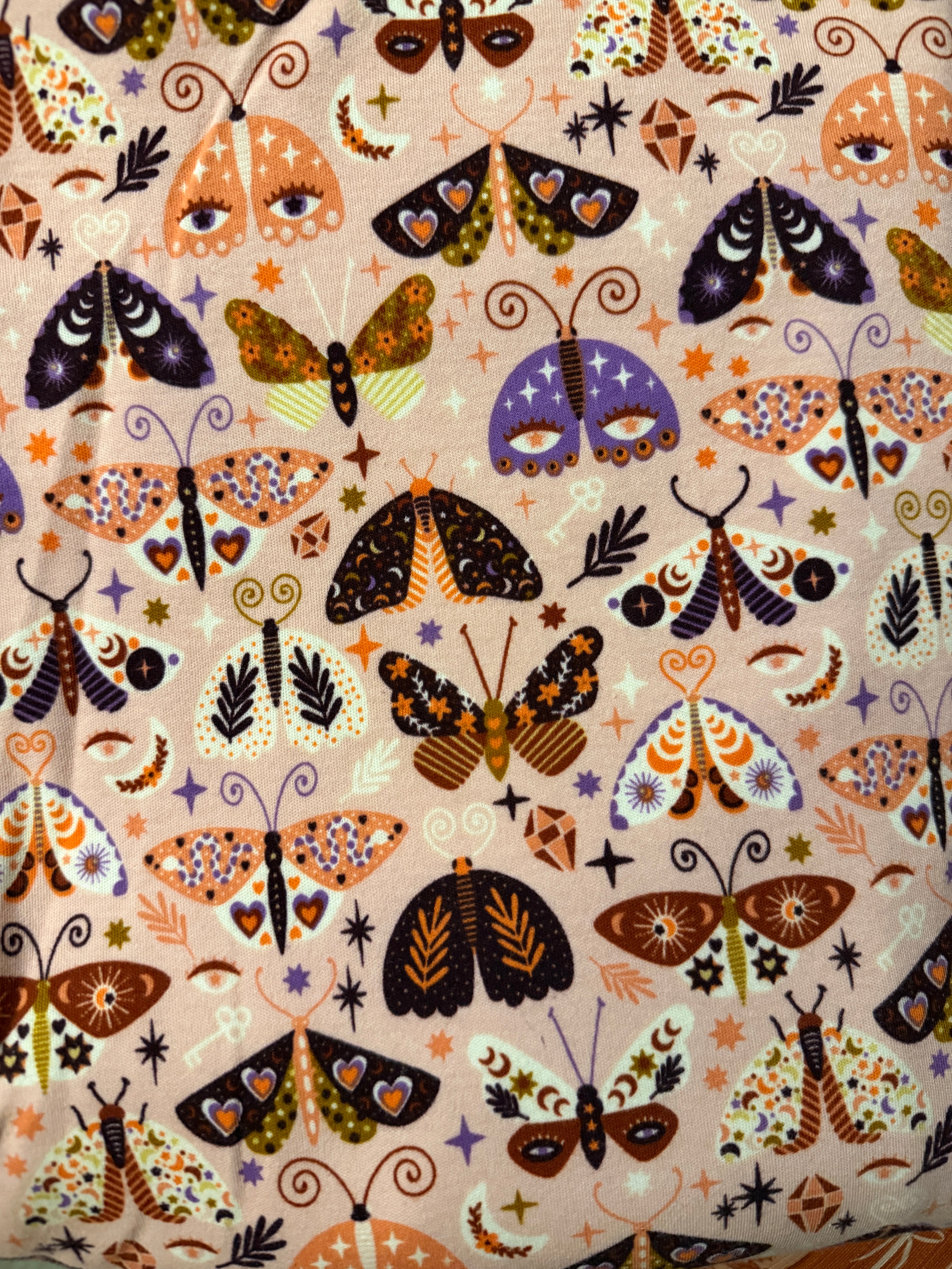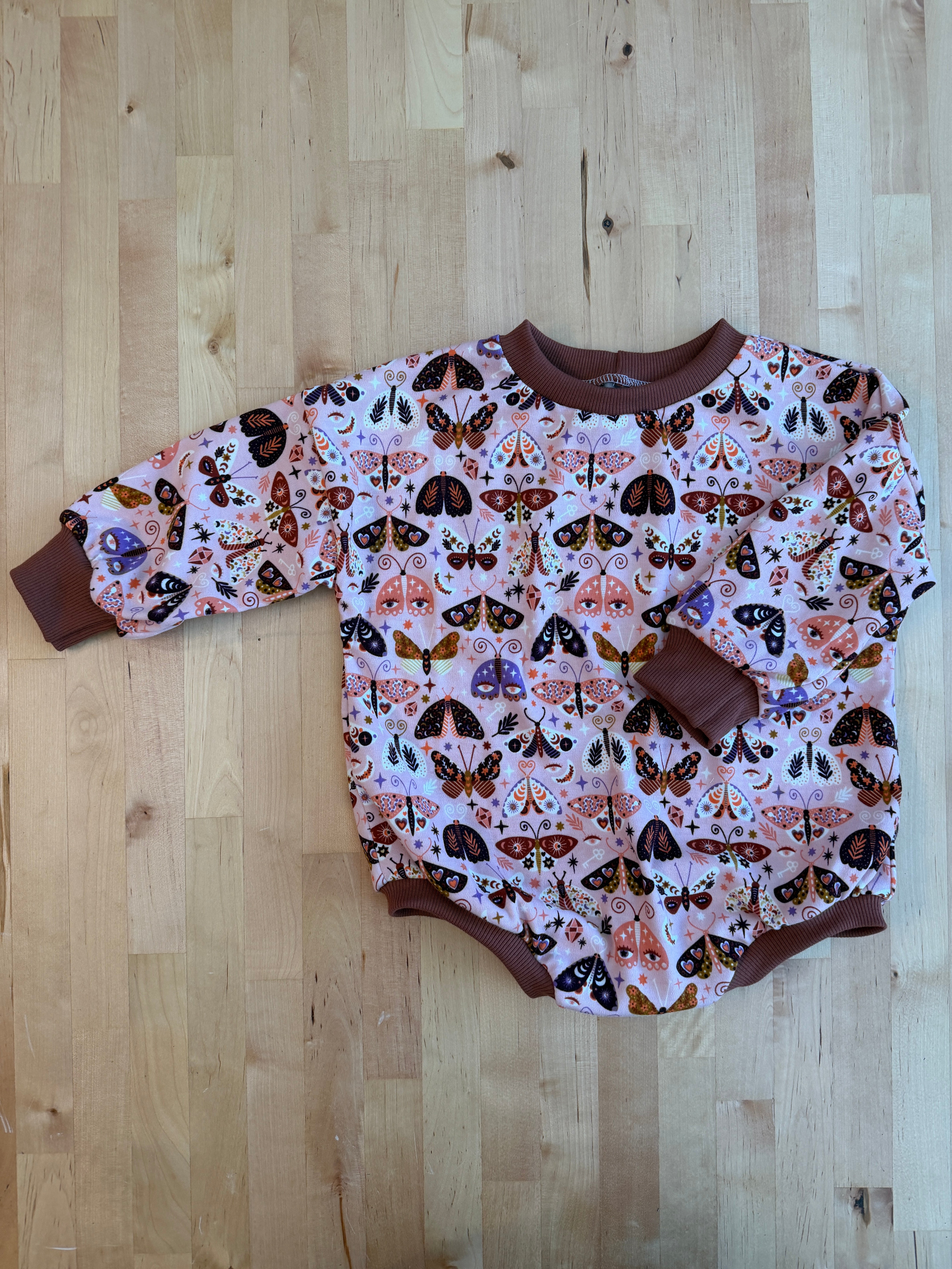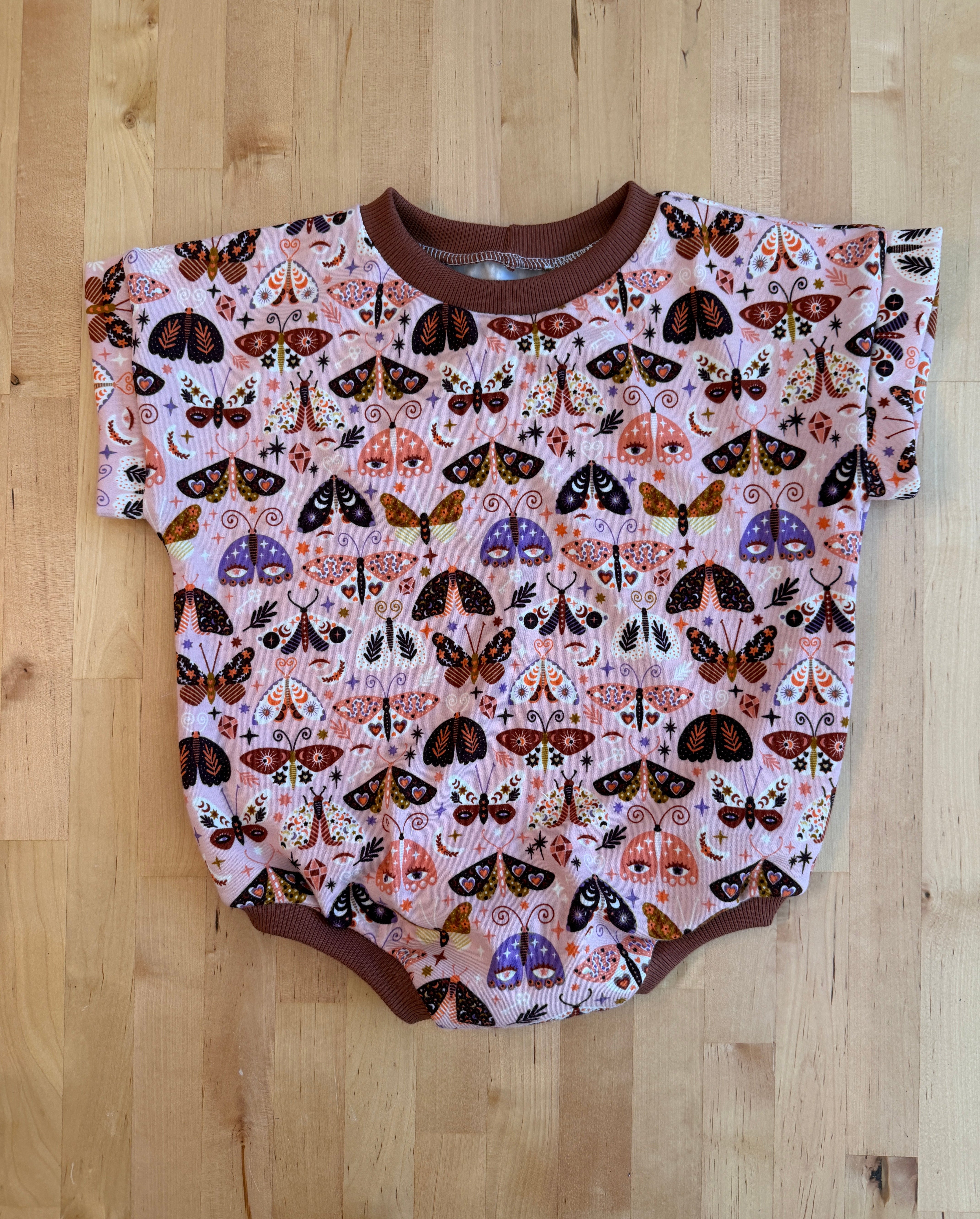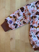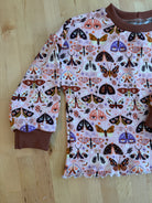 The cutest fall print featuring bold moths on a pink background. Paired with a coordinating rust rib, this look is sure to turn heads this fall!
