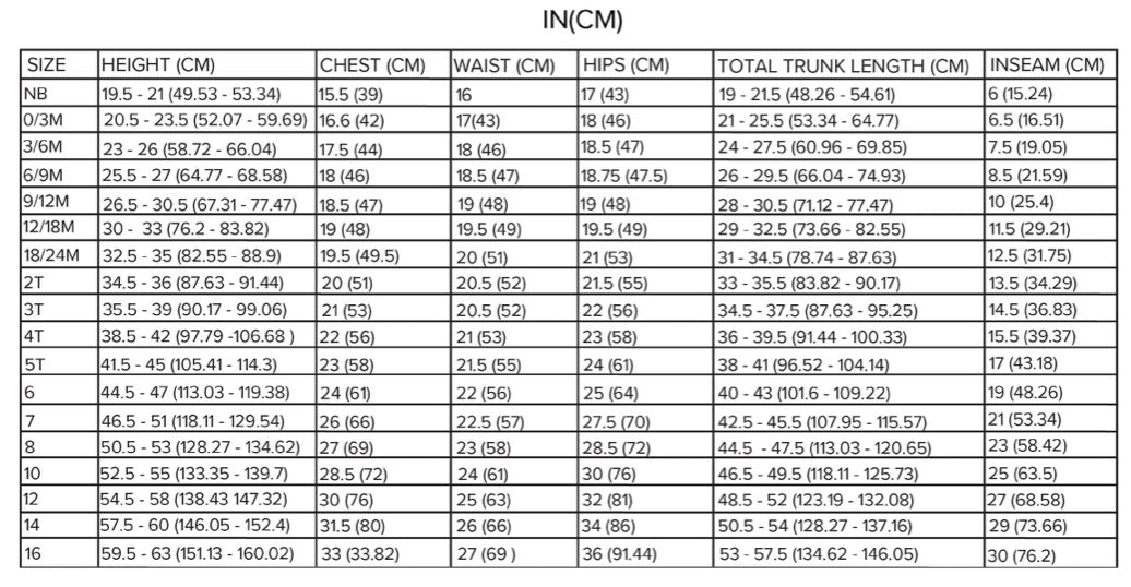 Our sizes range from 0-3 months to 4T. Use the charts below to find the perfect size for your little one. Measurements are presented in inches.