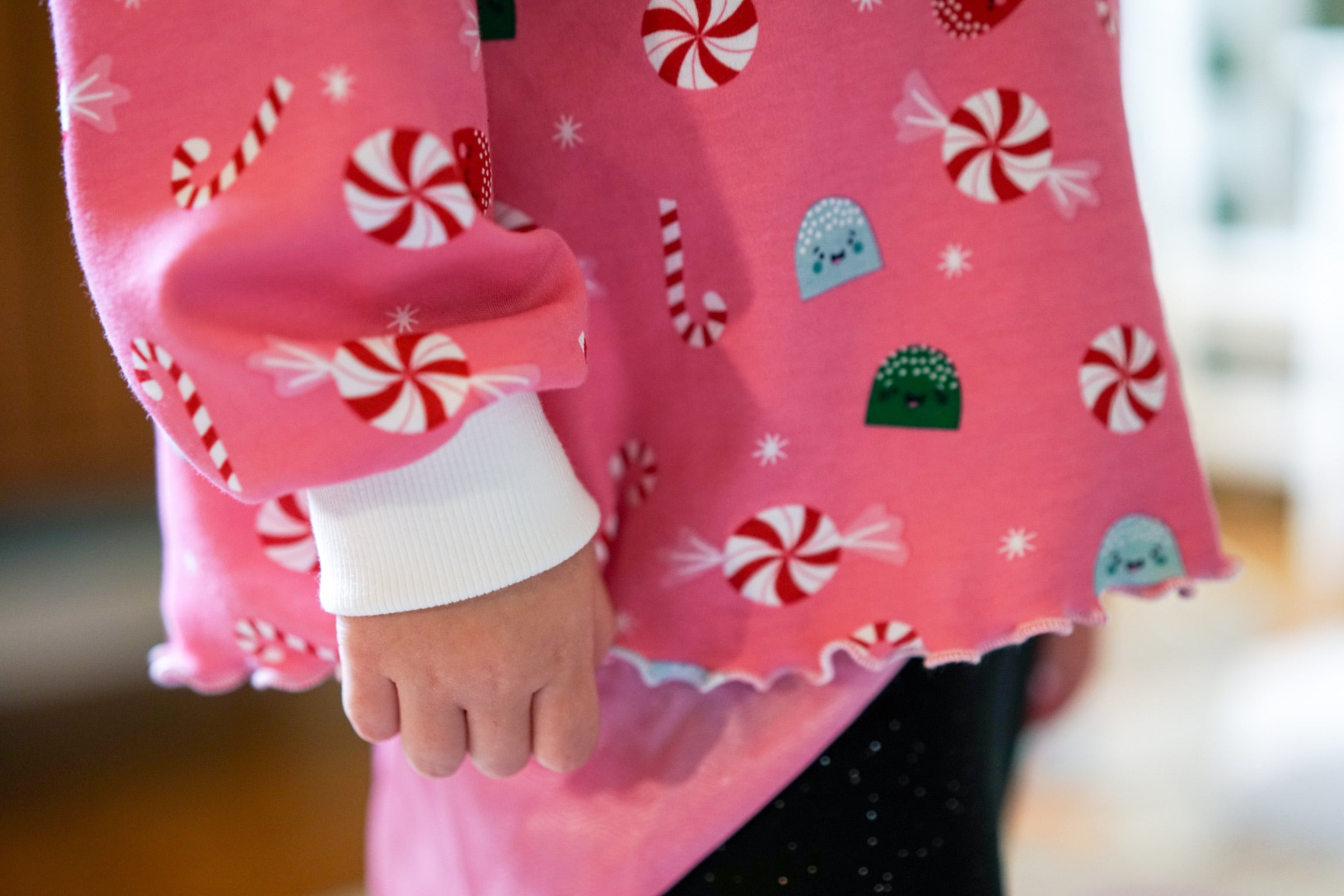 A whimsical pink candy-coated sweatshirt featuring a fun lettuce hem! This top is cozy soft perfection and handmade in Franklin, TN.